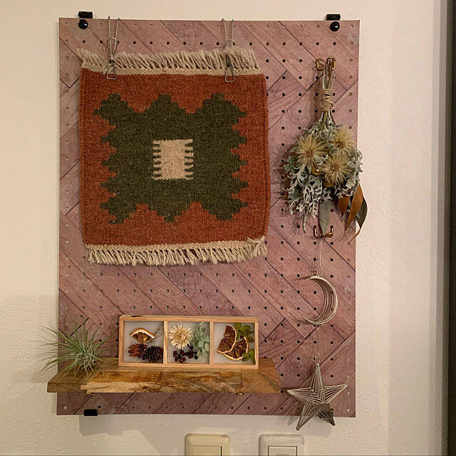 こちらはヘリンボーン柄の有孔ボードです。ヴィンテージ風カラーのヘリンボーン柄は、それだけでも、目を引くアクセントになります。ユーザーさんは、スワッグやキリムを飾って、より雰囲気アップされています