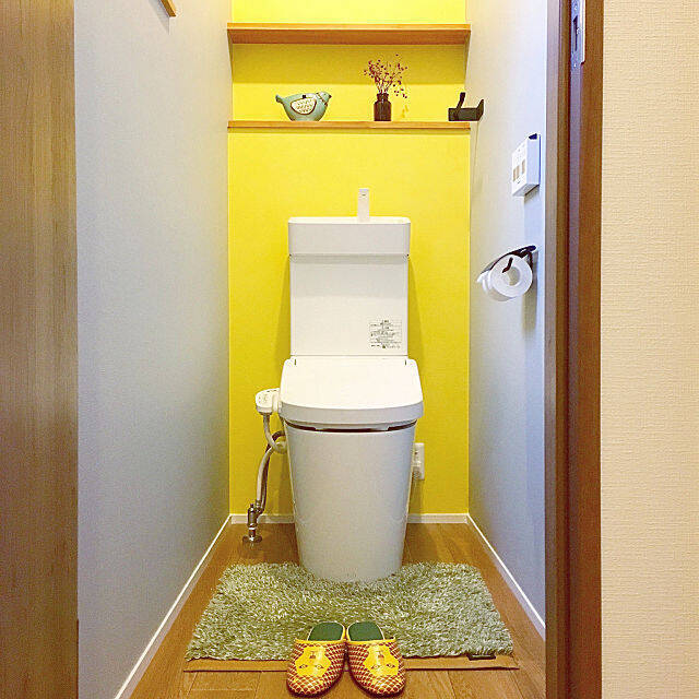 ユニークなライオンのスリッパが出迎えてくれる、ビビットなイエローが印象的なトイレ。扉を開けるとフレッシュな色が目に飛び込んできて、トイレに行くたび元気をチャージできそうです。グリーンのマットやブラウンの花瓶、鳥のオブジェなどすべてのアイテムが絶妙にマッチしてます。