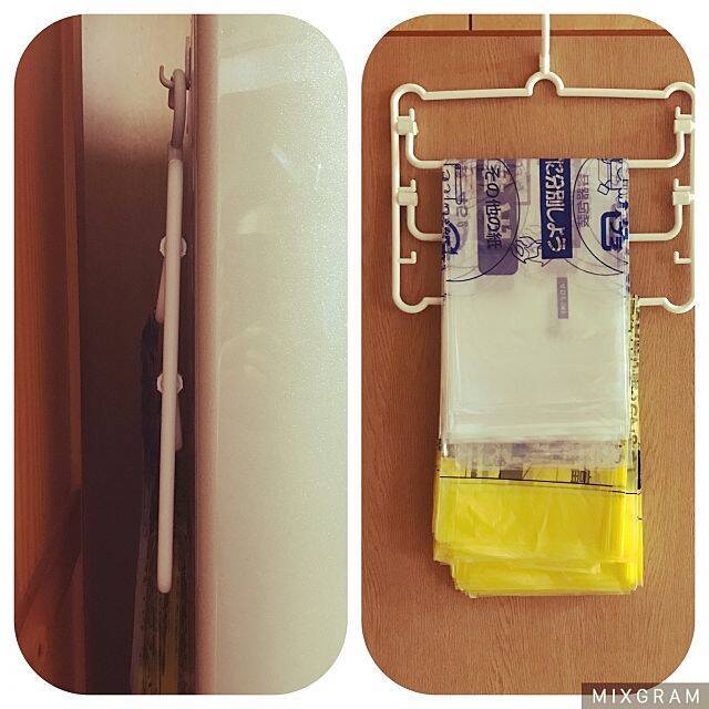 mamiさんは、パントリーの扉の裏にゴミ袋やビニール袋を掛けて収納しています。100均のタオルバーを設置し、ゴミ袋のストックを種類ごとに掛けてあります。扉を閉めると隠せて、ケースへの詰め替えの手間もなく、取り出しやすくて楽チンだそうです。