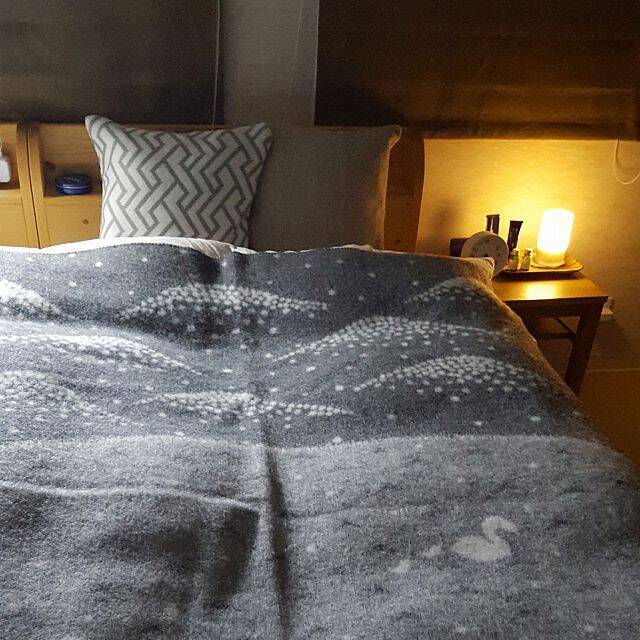 こちらのユーザーさんは、KLIPPAN(クリッパン)×mina perhonen(ミナペルホネン)のウールブランケットに、ウールのクッションカバーをコーディネートしています。無印良品のウール原毛色クッションカバーは、自然のままの色合いと風合いを生かして作られており、寝室にもぴったり。