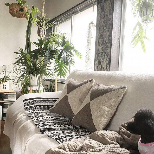 アフリカンテイストのインテリアに、無印良品のクッションカバーを合わせたこちらのユーザーさん。お部屋に馴染むだけでなく、生地がしっかりしていて、肌触りもよいそうです。こちらのウール混原毛色クッションカバーのベージュ×ブラウンは、流行のBOHOスタイルにも合わせやすそう。