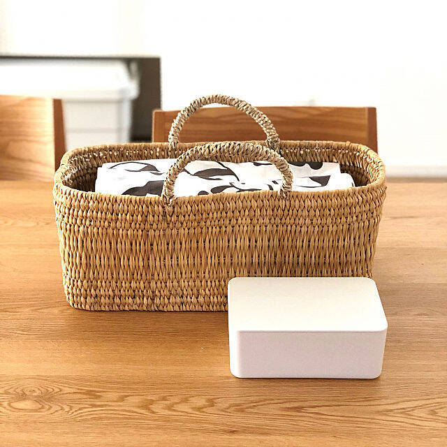 こちらのユーザーさんは、赤ちゃんのお世話に必要なアイテムをラタンボックス取っ手付・スタッカブルにまとめています。取り出しやすく、見た目もナチュラルなのが気に入っているそう。コンパクトで取っ手も付いているので、必要な時にはボックスごと持って行って使うことができますね。