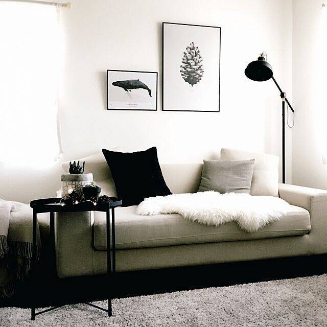 グレートーンでコーディネートされた、coonさんのリビング。トレイテーブルの無駄を省いたシンプルでスタイリッシュな形状は、モダンなお部屋をよりクールに見せています。淡いカラーの中にブラックを入れることで、空間が引き締まりますね。