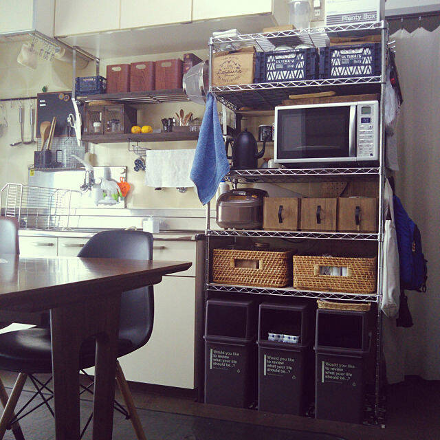 こちらのユーザーさんは、スチールラックの足元にごみ箱を入れています。棚板の位置を自由に設定できるスチールラックならではのアイディアですね。ボックスを上手に使い、すっきりとしたキッチンをキープしています。
