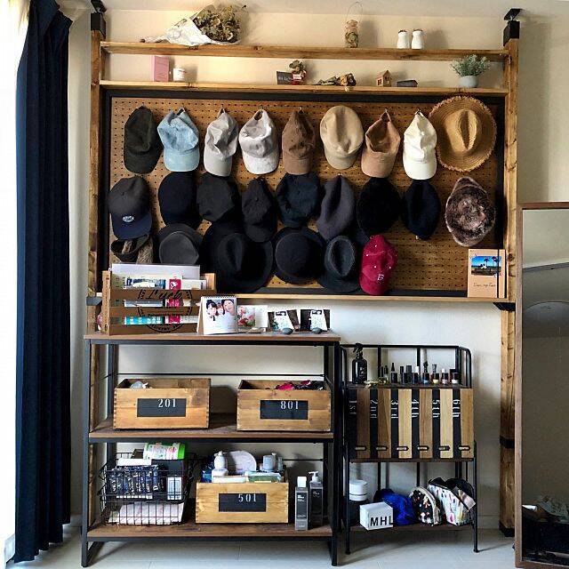 こちらのユーザーさんは、ペグボードに帽子を引っかけてディスプレイ。たくさんの帽子が壁いっぱいに並んでいますが、見やすく、きちんと整理整頓されています。引っかけることで、帽子の形もキープできそうですね。帽子のコレクションも、ペグボードを使えばすっきりまとまります。