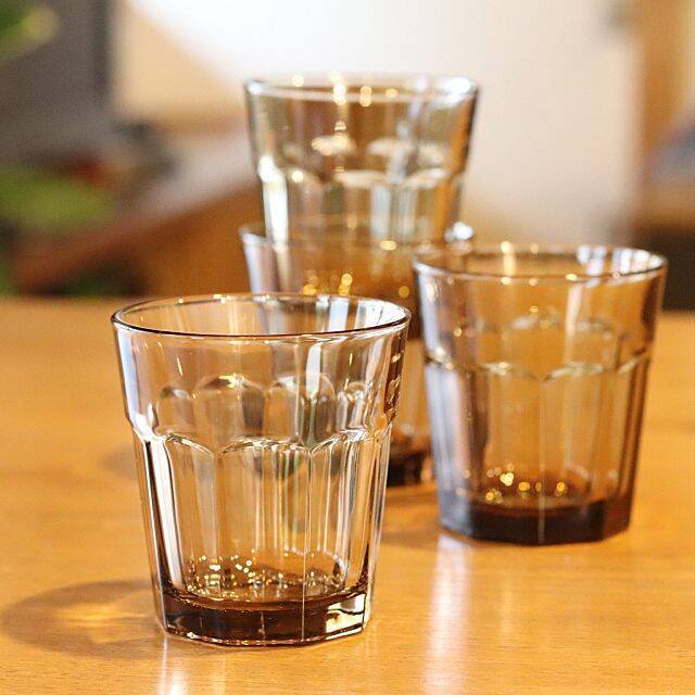 こちらは、セリアで購入できるアンバーグラスです。ひとりで一杯だけ飲みたい日や、大勢で集まっていろいろなお酒を楽しみたい日にも、使いやすそうなサイズ感ですね。絶妙な飴色のグラスは、ビールや水割り、ロックなど、さまざまなお酒にも合いそうです。