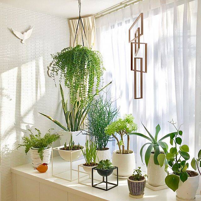 出窓のスペースに、観葉植物をまとめてディスプレイしている実例です。光をたくさん浴びて、どのグリーンも生き生きとしていますね。鉢や雑貨など、それぞれにこだわりが感じられるすっきりとした空間は、癒しとなってくれそうです。
