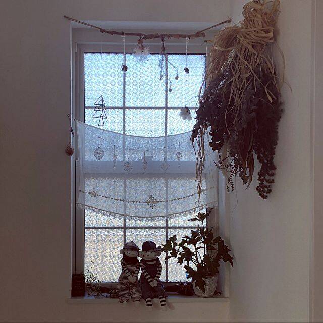 カーテンやガーランドをブラウン系でまとめた、ナチュラルでキュートな小窓です。窓台があるように見えますが、こちらは「かるかるブリック」という軽量レンガタイルを貼ったものだそうです。手軽に窓の雰囲気をアップしてくれる、魅力的なアイテムです。