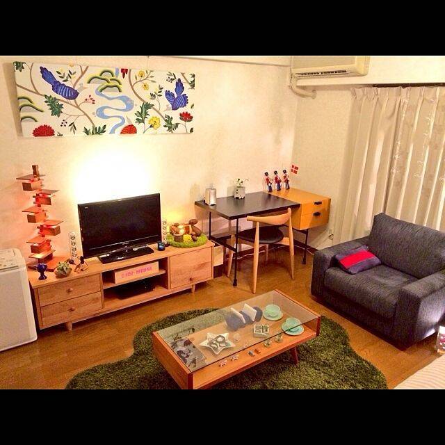 赤みのあるフロアに、ウッド素材でそろえられたテレビボードやテーブルが印象的なこちらの実例。明るい温もりを感じられるお部屋になっています。壁面インテリアで北欧風のカラフルな演出もされていて参考になりますね。