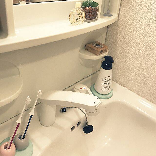 こちらはハンドソープと歯ブラシ立ての下に、珪藻土コースターをセット。毎日使う場所だから、清潔感は保ちたいですよね。白い洗面台で、ブルーのコースターがアクセントになっています。