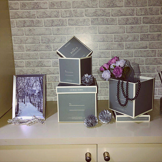 クールでスタイリッシュな玄関ディスプレイに取り入れているのは、グレーのペーパーボックス。お花を一緒にアレンジしたり、色使いなども上手で、とてもセンスを感じるディスプレイです。大きさ違いの箱を積み重ねるテクニックは、ディスプレイ方法として参考にしたいですね。