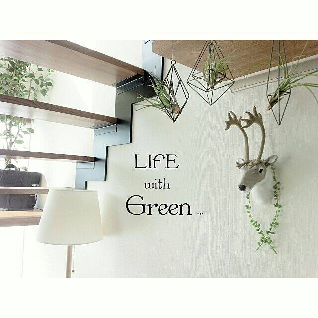 階段下のスペースで小さめのハンギングプランターをつかいグリーンをディスプレイしているユーザーさんがこちらです。エアープランツにぴったりな、オーナメントタイプのプランターが魅力的ですね。