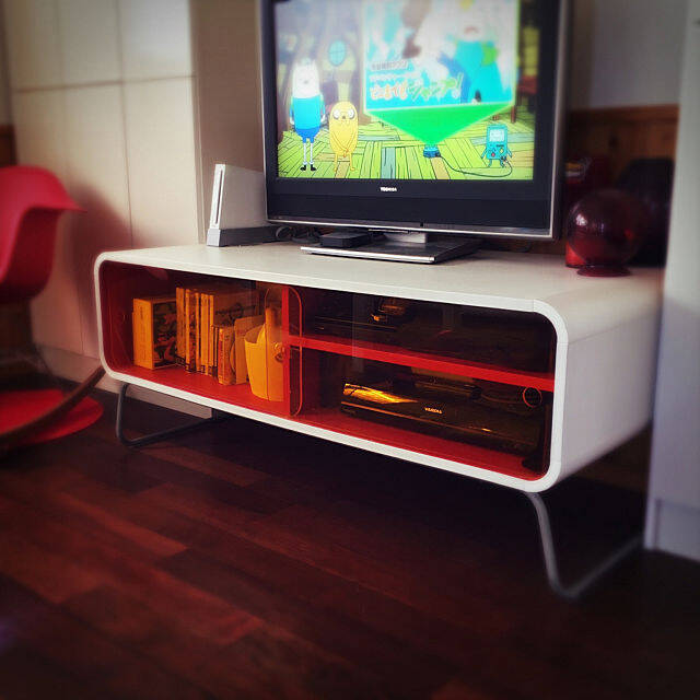 こちらのテレビボードはディノスのもの。曲線的なフォルムやクリアな素材のアクリル引き戸が、近未来の雰囲気たっぷりです。内側の赤いカラーが目を引くアクセントになっていますね。