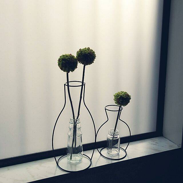 穏やかな空気感に包まれた窓辺に、シンプルなフラワーベースが並んでいます。ガラスの瓶はワイヤーのシルエットがあって初めて、フラワーベースの形となります。遊び心が感じられるアイテムですね。