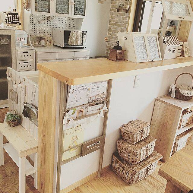 こちらの手作り本棚は、カウンター下のちょっとしたスペースに設置されています。奥行が短いため、作業の邪魔にもなりません。表紙を見せるタイプの本棚には、お気に入りの本を飾って楽しみたいですね。掛けられたガーランドともマッチしています。