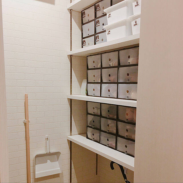次に靴箱の下やその周りを活用した、スキマ・デッドスペース収納をご紹介します。ユーザーさんは、つっぱり棚や引っ掛け式のシューズラックなど便利なアイテムを駆使されていました。おうちにぴったりのサイズにDIYしてみるのもおすすめです。