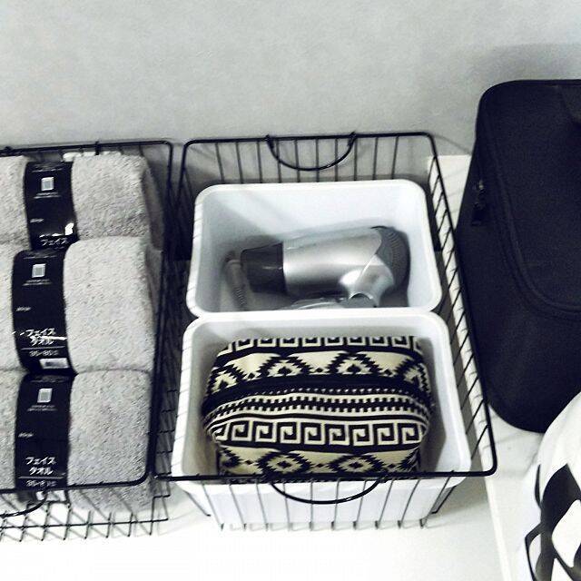 黒いクールなダイソーのカゴに、ホワイトの収納ボックス2つをはめてつかっているこちらのユーザーさん。2つのアイテムがぴったりはまったそうですが、カラーコーディネートの面でもうれしいフィットですね。すっきりした見栄えも素敵です。