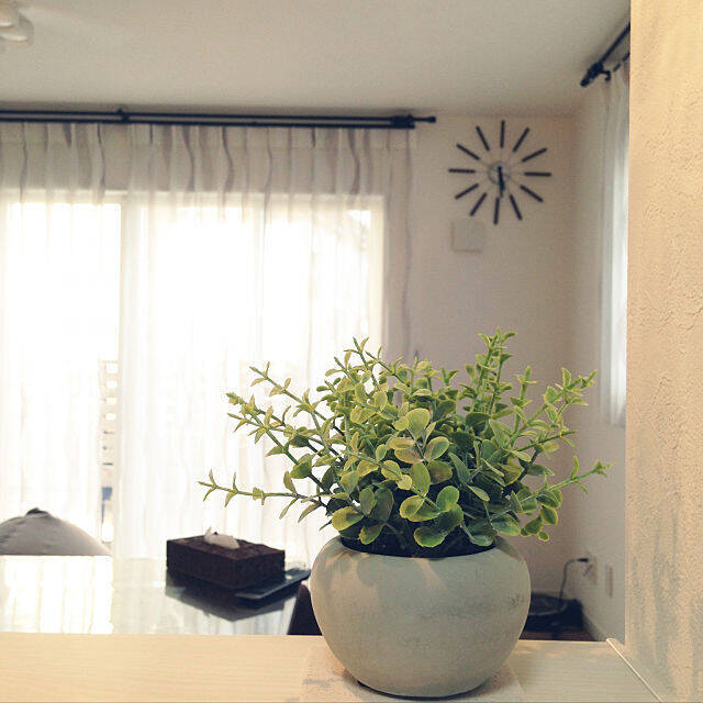 yukaringoooさんは、リビングの窓際に大型のフェイクグリーン、フィカスを飾られています。入り組んだ幹とスッと伸びた枝など、忠実に作られた迫力あるフェイクグリーンです。スタイリッシュなモノトーンにグリーンを添えると、グッと引き締まりカッコいいです。