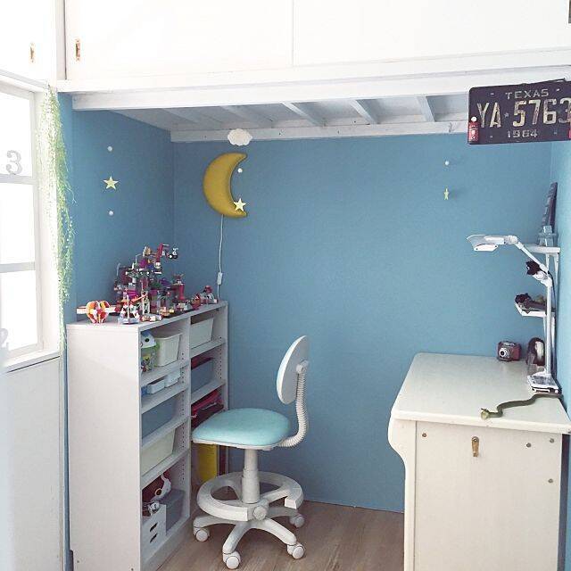 押入れ全部を利用したのが、こちらの子ども部屋。淡いブルーの壁がやさしく、白い家具が美しく映えますね。狭い空間もこんな風に姿を変えて、息子さんのお城になりました。