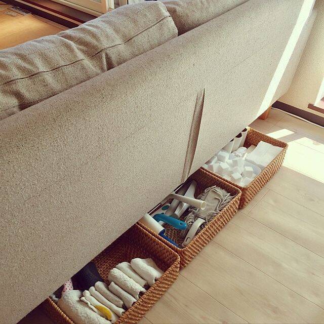 リビングに散らかしたくないお掃除道具は、ソファの下のスペースにこんなに美しく収まります。きちんと感のあるアイテムを使うことで、隠すのではなく、お掃除道具の居場所になっています。