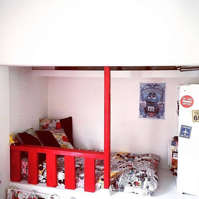 真っ赤な柵に目を奪われるベッドルームは、押入れの上段を利用したものです。大人には狭いスペースでも、お子さんにはワクワクするような夢の世界に映ることでしょう。