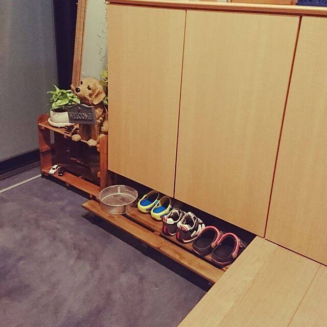 こちらでは、玄関の靴箱の下のスペースを収納場所として利用しています。キャスター付きのすのこに靴を乗せて、出し入れもお掃除もラクラクです。見えない場所が大活躍のアイデアです。