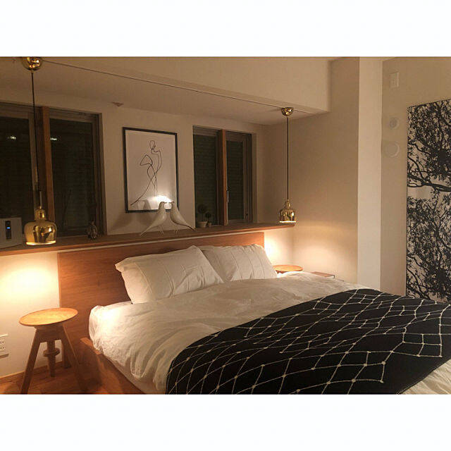 pomqujackさんは、二つのペンダントライトを低い位置までおろし、ベッドサイドの壁や床を照らして、間接照明としてふんわりとした優しい灯りを取り入れています。ベッドまわりのポスターやオブジェなど、シンプルな中にもセンスのよさが光るスタイリッシュな寝室です。