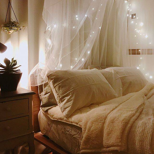 ジュエリーライトを取り入れると、寝室がグッとロマンティックな雰囲気になりますよ。anemone55さんは、天蓋にジュエリーライトを這わせて、まるでお姫様のベッドのような雰囲気を作り出しています。ロマンティックな雰囲気にうっとりしながら、眠りにつくことができそうです。