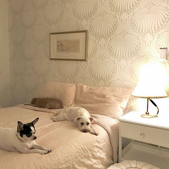 サイドテーブルに置かれたスタンドライトは、枕元を優しく照らし、眠る前のひとときをリラックスモードへと導いてくれます。Sacco38さんは、エレガントなベッドルームにピッタリな、上品なフォルムのライトで癒しの空間を作り出しています。優しい灯りに照らされ、ワンちゃん達もすっかりリラックスしていますね。