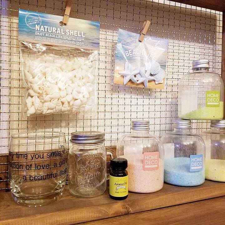 お好みのデザイン・サイズの瓶やグラス【Seria(セリア) 売場:食器】カラーサンド1【ダイソー 売場:グリーン/ガーデニング】カラーサンド2【ダイソー 売場:グリーン/ガーデニング】カラーサンド3【ダイソー 売場:グリーン/ガーデニング】カラーサンド4【ダイソー 売場:グリーン/ガーデニング】貝殻1【Seria(セリア) 売場:季節品】貝殻2【Seria(セリア) 売場:季節品】アロマオイル【ダイソー 売場:その他】■必要な道具