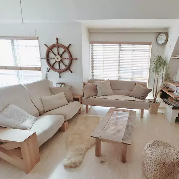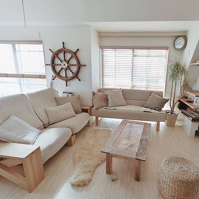 色味を抑えると、ぼんやりしてしまうのでは?と思っている方にぜひ見ていただきたいのが、6omiさんのコーディネートです。全体的にナチュラルな色を使っていますが、大きな舵のディスプレイがポイントとなり、インパクトのあるインテリアに仕上がっています。ビーチカフェのような、リラックス空間ですね。