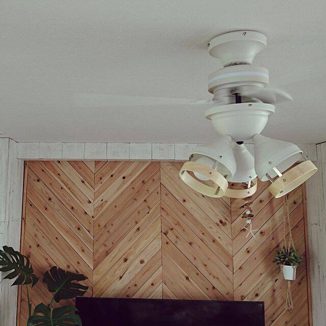 シーリングファンライトは、リゾートインテリアにもってこいのアイテム。mykooさんが選んだのは、さわやかなホワイトのライトです。ボリュームの出すぎない3枚羽のタイプで、圧迫感なく使えているとのことですよ。ヘリンボーンの壁との組み合わせで、より海を感じる空間に仕上がっています。