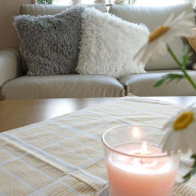 やわらかな日差しが差し込むyellowflowerさんのリビングは、おだやかな雰囲気でいっぱいです。ソファの上にはお部屋にとけ込むカラー、シルバー&ホワイトのふわふわとしたニトリのクッションが。優しいぬくもりをもたらしてくれるデザインと質感で、のんびりとした時間を過ごせそうです。
