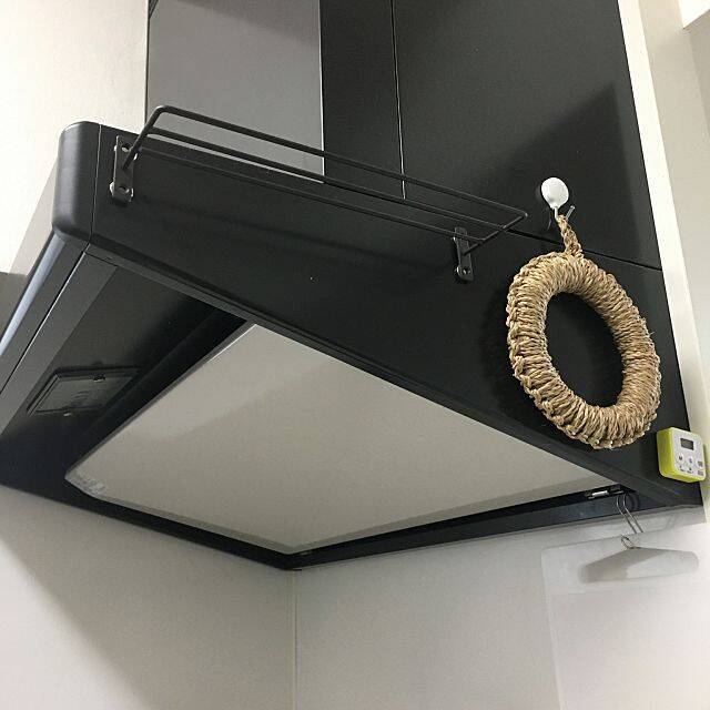 レンジフードの側面は、磁石が張り付くので、強力マグネットを活用する場所として使いやすいですね。aiiaさんは、セリアのアイアンバーをマグネットで張り付けて、布巾かけにしています。ネジで固定しなければならないアイアンバーですが、ネジも要らず、穴もあけずに使えるのはうれしいですね。