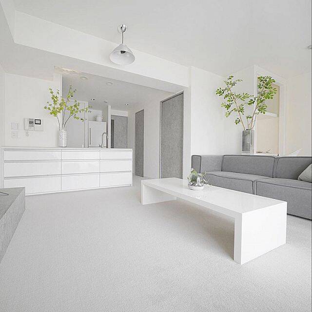 白さが際立つすっきりとしたリビングです。ローテーブルやキッチンカウンターの直線的なラインが、お部屋をきりっと引き締めています。ものをあまり出さずに空間を多く見せるという要素もポイントで、これぞシンプルモダンという洗練されたお部屋です。