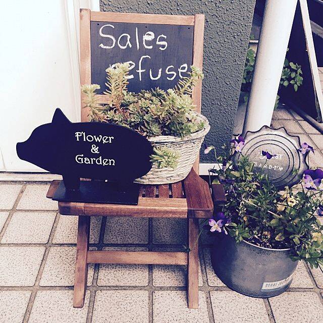 Ayaさんが取り入れたガーデンアイテムは、こぶたのスチールオーナメント。デザインは、黒に白文字というとてもシンプルなものです。こぶたのシルエットがとても愛らしく、ウッドチェアの形をしたフラワースタンドとの相性もバッチリですね。デザインがシンプルだからこそ、お庭に取り入れやすいアイテムです。