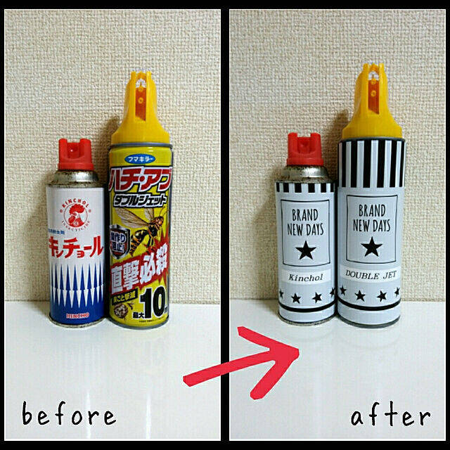スプレー缶カバー使用前、使用後のatsuさんの写真です。部屋の雰囲気ががらりと変わるのがお分かりでしょうか?スプレー缶カバーひとつで、インテリアの雰囲気がまとまるのが驚きですね。ぜひ取り入れたいアイテムです!