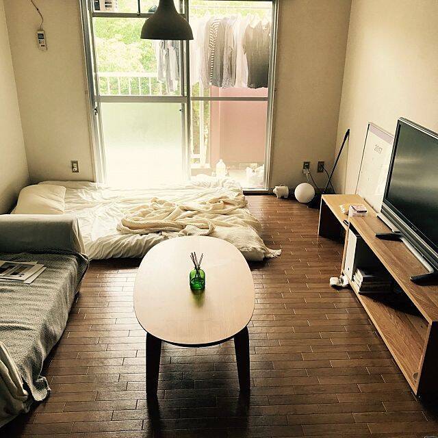 無印良品のアイテムをお部屋にたくさん取り入れている、oikskさんです。掛け布団には、無印良品のオーガニックコットン素材のワッフルケットを使っています。布団スペースがシンプルですっきりとした、清潔感のある印象になっていますね。