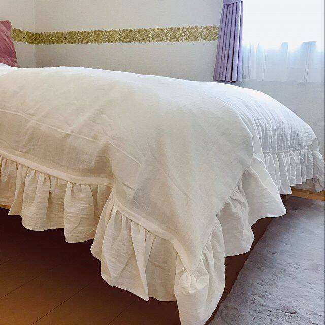 ニトリの爽やかなホワイトカラーの寝具を、チョイスしているユーザーさん。フリルが豪華な雰囲気で、お姫様気分で就寝できそうです。エレガントな壁やカーテンとも、相性抜群ですね。