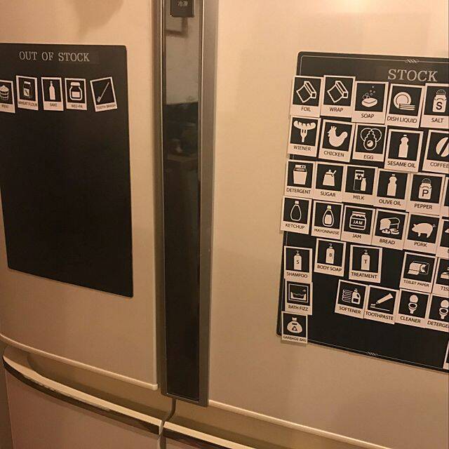 食材のイラストをマグネットペーパーにプリントし、冷蔵庫扉で在庫管理をしています。在庫がないものは、右の扉から左の扉にマグネットを移動させるだけなので、一目で必要なものがわかりますね。モノトーンのシンプルデザインだから、たくさん貼ってもスッキリとした印象です。