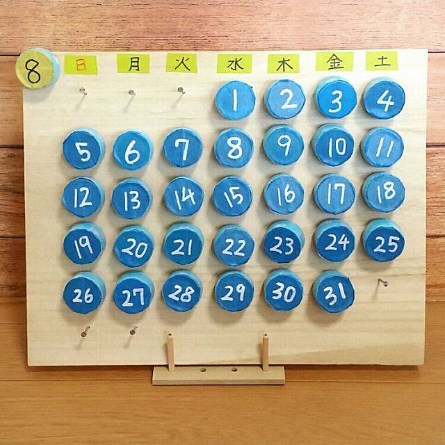 ペットボトルのキャップを使って万年カレンダーを作ったのは、hanaさんの6年生の息子さん。板に釘を打ち、マスキングテープを貼ったキャップをひっかけているそうです。日にちの感覚が身につきそうな、いいアイデアですね。低学年の子には、コルクボードに画びょうをさして作るとよいとのことです。