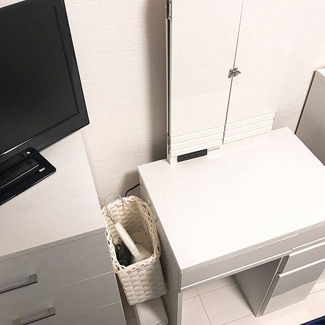 donさんは、ドレッサーの横にエコクラフトのカゴをつけてドライヤーを収納にしています。ドレッサーと同じ色のクラフトバンドで作っているので、統一感があります。温まったドライヤーは、すぐに引き出しにはしまいにくいですよね。でもそのままひっかけたくもない、という方にオススメです。