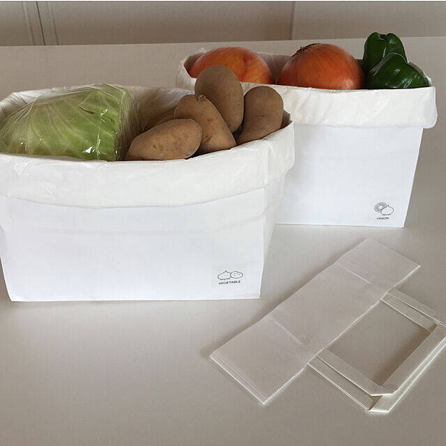 リメイクでストックバッグを作られているhiroさん。こちらは、5枚入りの「白無地 シンプル手提げ袋 小」です。ハンドル部分をカットし、レジ袋と重ね合わせ野菜のイラストをワンポイントあしらって♡シンプルなバッグが、可愛く便利に生まれ変わっています。