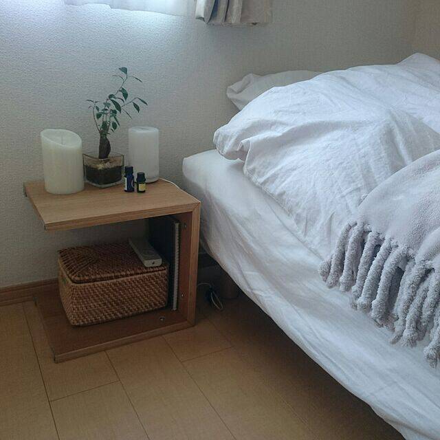 こちらも無印良品のコンパクトなタイプのアロマディフューザーを使用。枕元に取り付けられた棚に置かれています。小さなお子さんと一緒に寝ているのか、無印良品の壁に取り付けるタイプの棚に絵本が並んでいます。それがディスプレイのようでおしゃれです。