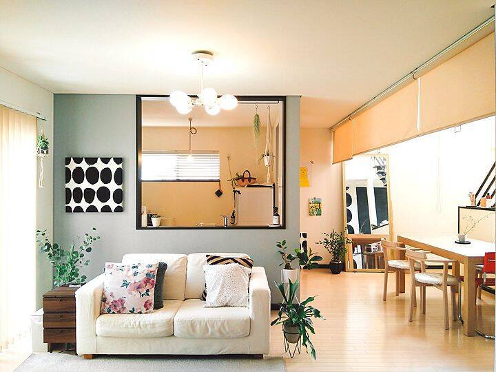 y.mさん宅は、ゆったりとした開放感のある、北欧モダンな雰囲気の空間が広がっています。センスよく取り入れられたアクセントが、シンプルさに小気味よく個性を添えているのが素敵です。LDKに、四角く大きく開けた窓から覗くキッチンも、スッキリとしていてインテリアに馴染んでいるのが印象的ですね。開けたキッチンだからこその収納へのこだわりや、生活感をオフする工夫がきっとあるはず!まずは、その辺りからお伺いしてみたいと思います。