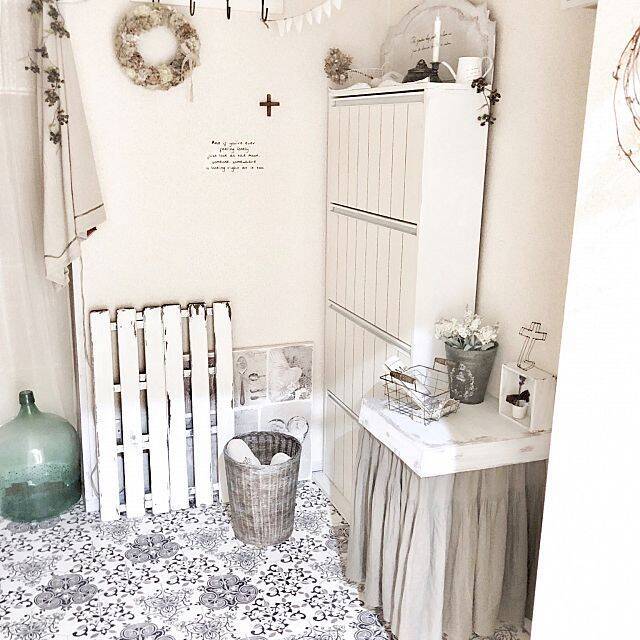 「窓がなくても明るい玄関にしたい」と考えたtarさん。その理想を叶えるべく選んだアイテムはマヨリカタイル柄のクッションフロアです。玄関床一面にクッションフロアを敷き詰め白い家具や雑貨とコーディネート。今ある環境を最大限に活かし、「家の顔」といわれる玄関を明るく爽やかな空間へと生まれ変わらせています。