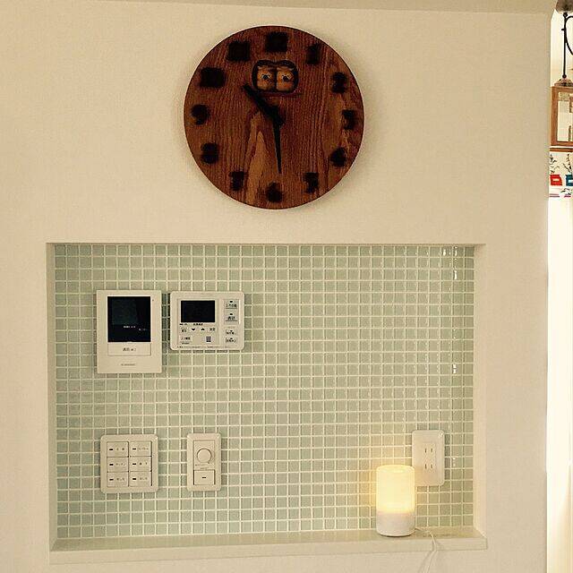 スイッチが並ぶ小さなスペースに、アロマディフューザーを置いています。爽やかなミントグリーンのガラスタイルと、ふくろうが並んだ時計がかわいいスペースですね。すぐ近くにはコンセントが作ってあります。長くコードを伸ばさなくて済むので、スッキリして見えますね。