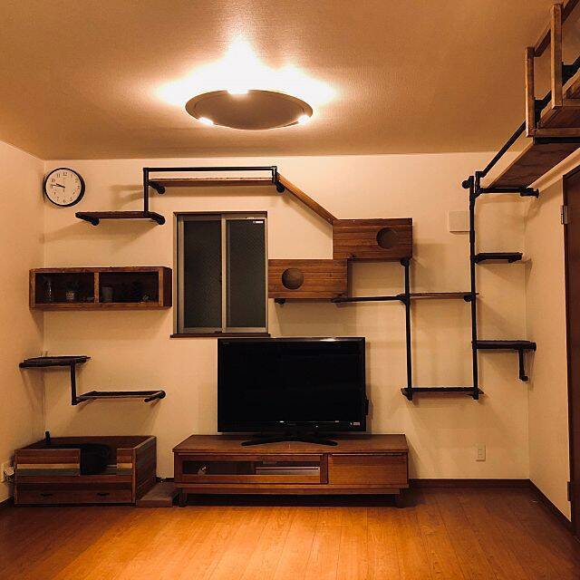 こちらは猫とともに過ごすリビングという感じで、テレビの周りにキャットウォークを設置しています。イレクターパイプという樹脂製のパイプの中に鉄のパイプが入っているものと、木製の棚を組み合わせています。下には猫ちゃんのトイレも。茶と黒で統一されたシンプルさがいいですね。