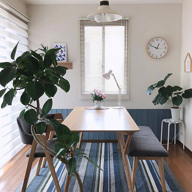 さわやかなブルーが印象的なお部屋に、ストライプのラグが敷いてあります。ブルーとストライプという組み合わせがとびきりクールですね。テーブルの上に飾ってある母の日のピンクのカーネーションが目立ちます。ユーザーさんは赤ではなくピンクのカーネーションを選んでいて、クールな中にもやさしさを添えています。