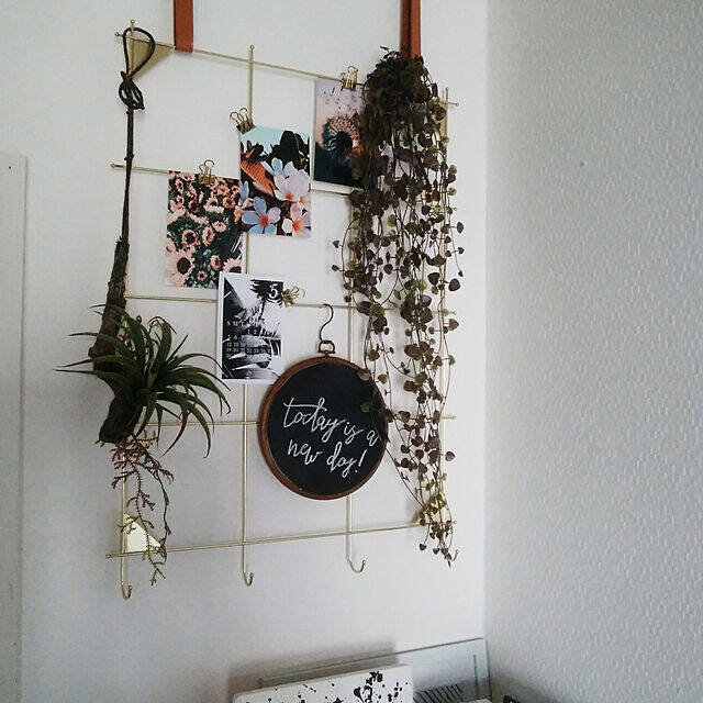 IKEAのミールヘイデンというメモボードを、フォトフレームとして使っています。この商品はクリップやフックが付いているので、写真やフェイクグリーンを付けながら、鍵なども引っ掛けられます。こちらのユーザーさんも写真とフェイクグリーンに刺繍枠を下げていますね。花の写真とフェイクグリーンが合っています。